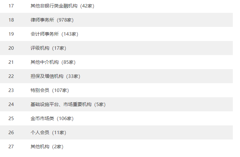 NAFMII在中国人民银行(PBoC)指导下开展工作,作为自律组织(SRO),由市场参与者自愿加入为会员,旨在促进银行间市场的发展,截至2024年2月22日,交易商协会会员数量为9648家,机构类型涵盖银行、证券公司、保险公司、基金管理公司、律师事务所、会计师事务所和非金融企业等。